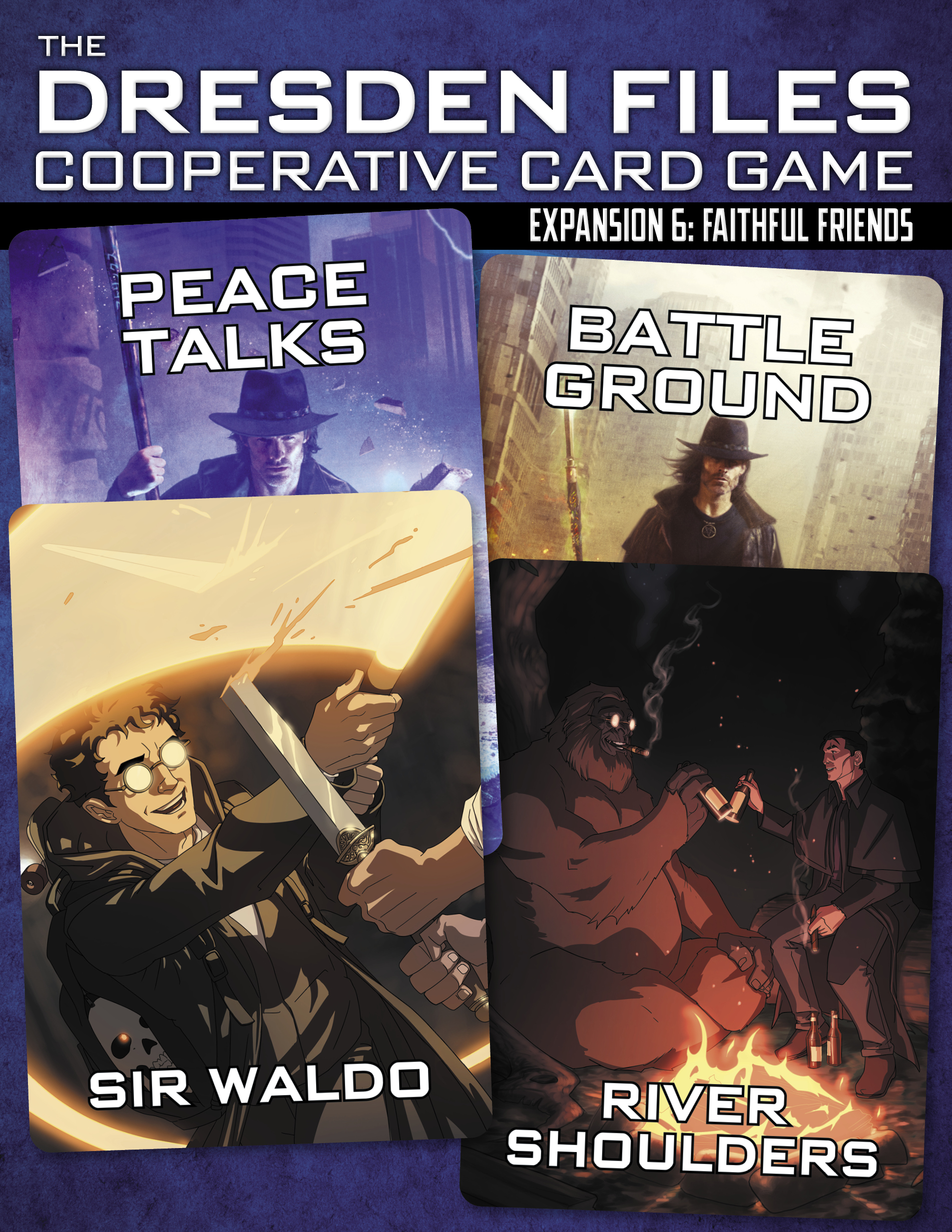 …but don’t despair—you’ve got faith on your side in this expansion for the Dresden Files Cooperative Card Game! Inside you’ll find two new character decks—Sir Waldo and River Shoulders—and two new book decks—Peace Talks and Battle Ground.